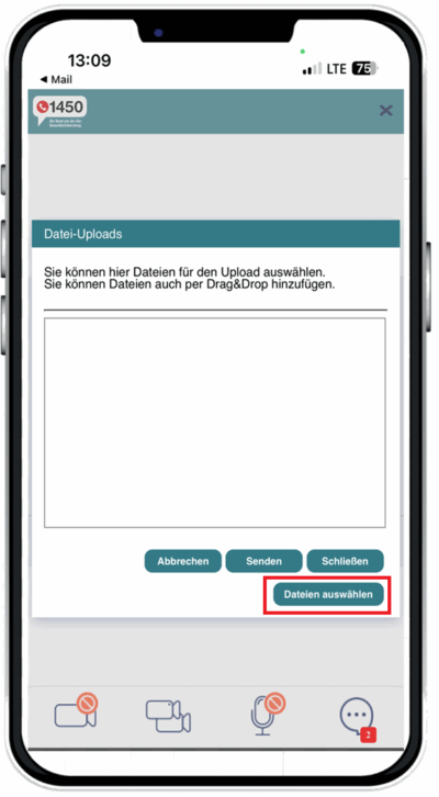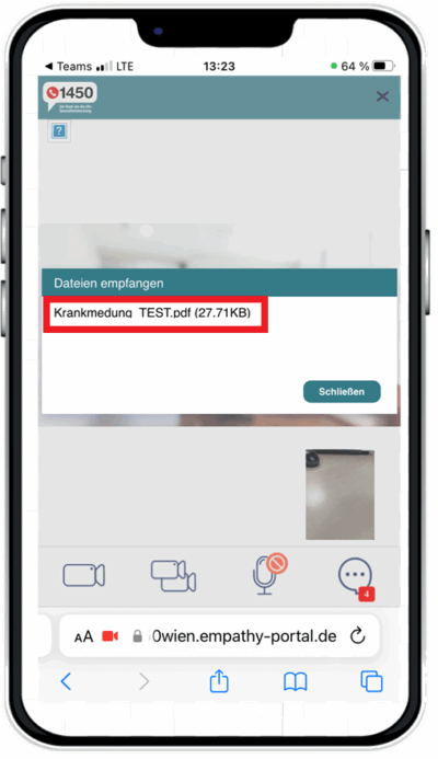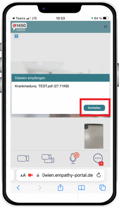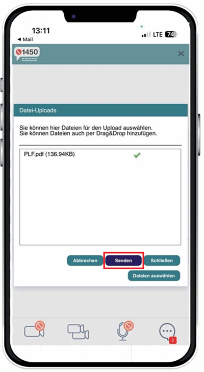 Sie können während der ärztlichen Videoberatung Ihren Befund hochladen. Informieren Sie darüber den:die Ärzt:in im Gespräch, dass Sie einen Befund vorweisen möchten.