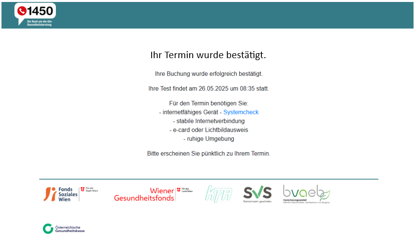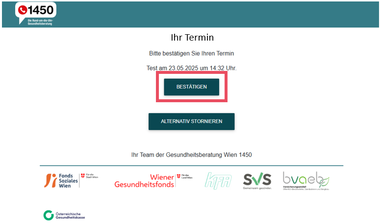 Während des Telefongesprächs erhalten Sie von dem:der Mitarbeiter:in der Gesundheitsberatung 1450 Wien eine SMS bzw. eine E-Mail zur Terminbestätigung. Die Terminbestätigung ist sofort nach Erhalt der SMS bzw. E-Mail erforderlich, da sonst die Verbindlichkeit der Terminbuchung nicht gewährleistet werden kann.