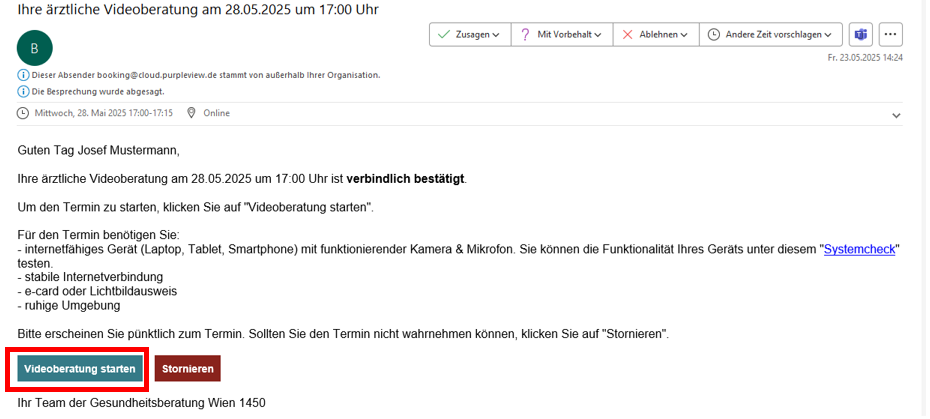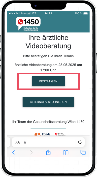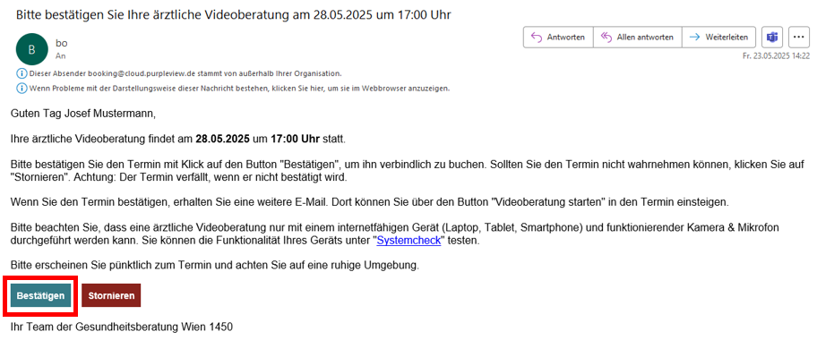E-Mail: Bitte klicken Sie sofort nach Erhalt in der E-Mail auf die Schaltfläche „Bestätigen“, um den Termin zuzusagen.