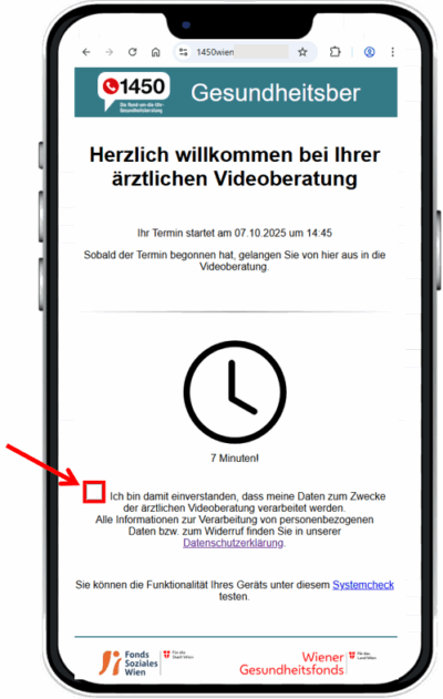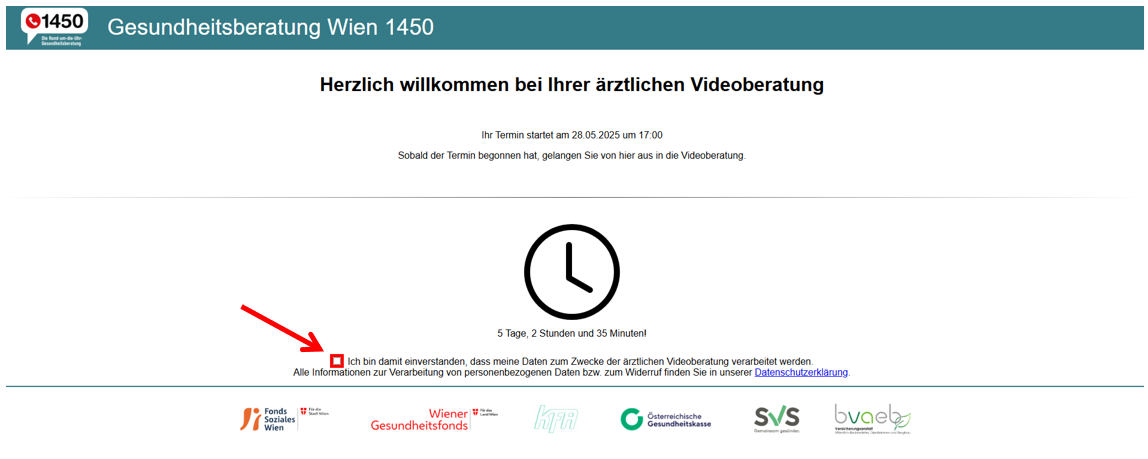 Bitte öffnen Sie rechtzeitig zum Termin den Link und bestätigen Sie das Kästchen zur Einwilligung der Datenverarbeitung.