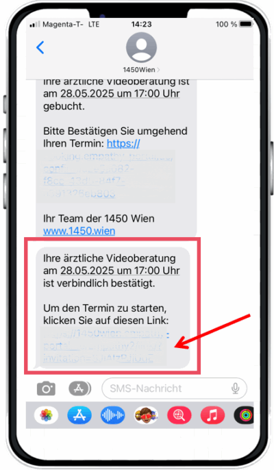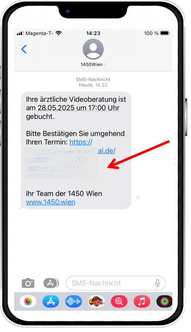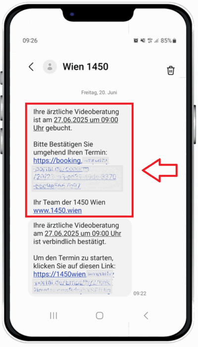 SMS: Klicken Sie dafür wieder auf den Link (blauen Text) in der zweiten SMS, um den Termin zu starten.