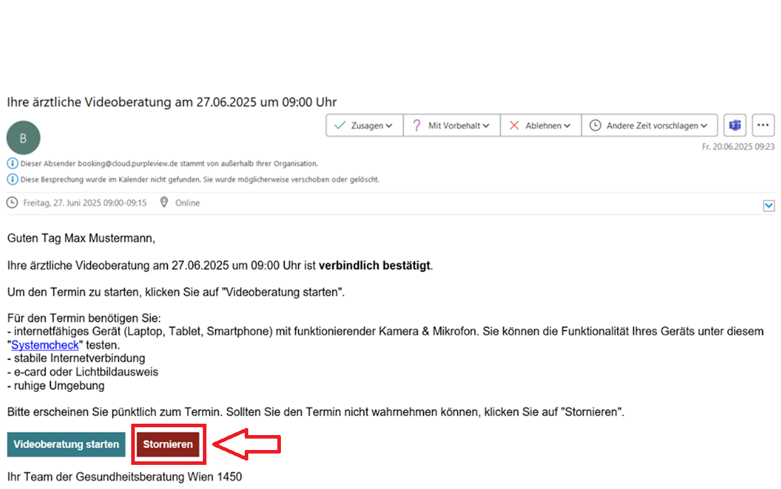 E-Mail: Wenn Sie eine E-Mail zum Bestätigen des Termins erhalten haben, klicken Sie in dieser auf die Schaltfläche „Stornieren“.