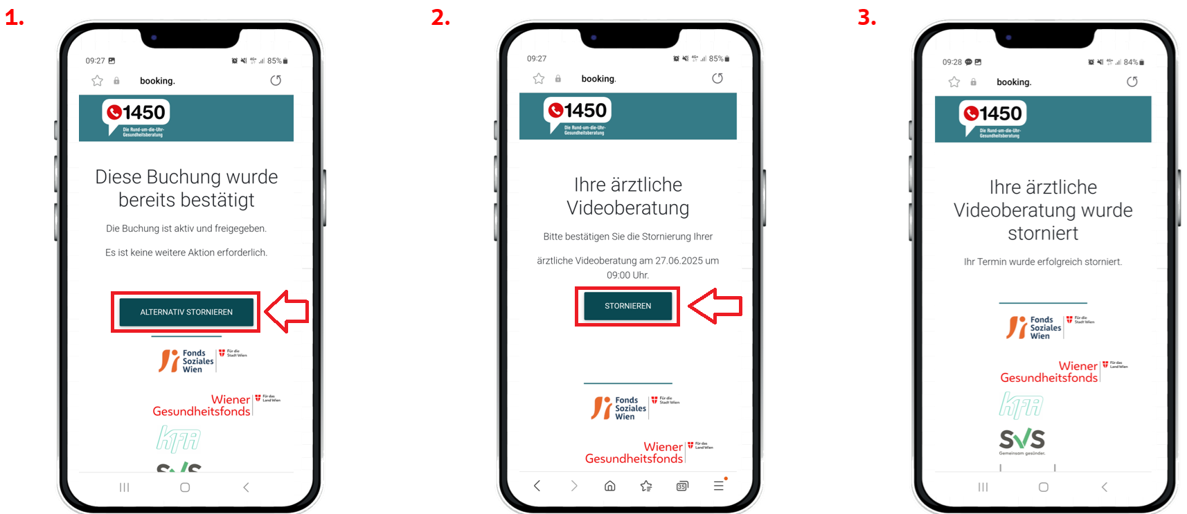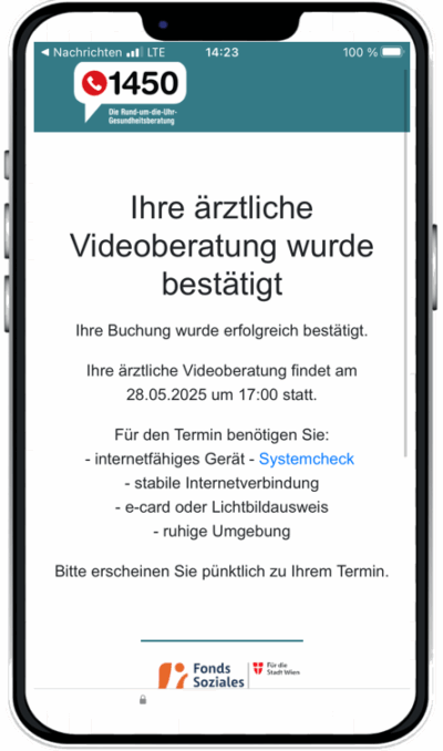 Die aktuellen Servicezeiten sind werktags von 08:00 bis 12:00 Uhr sowie von 14:00 bis 18:00 Uhr. Im Gespräch mit 1450 Wien wird der nächste freie Termin für Sie gebucht. Dabei wird die Terminbestätigung für die ärztliche Videoberatung per SMS oder per E-Mail an Sie versendet. Sie können direkt mit dem Smartphone, Laptop oder Tablet an der Videokonsultation teilnehmen.