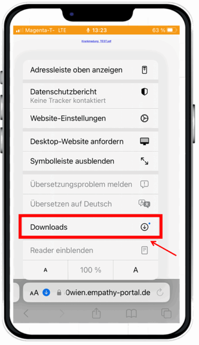 Dadurch wird die Datei runtergeladen und in dem Download-Ordner abgespeichert. Klicken Sie bitte auf den blauen Pfeil (siehe Screenshot) und anschließend auf „Downloads“, um den Download-Ordner zu öffnen: