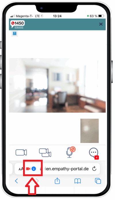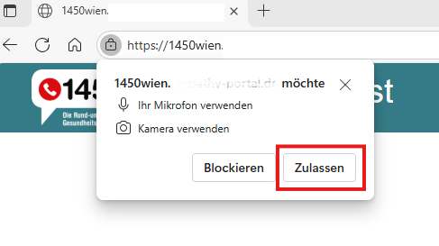Sollten Sie vorher keinen Systemcheck (siehe Schritt 5) gemacht haben, müssen Sie im Browserfenster einmalig dem Programm die Erlaubnis geben, Ihr Mikrofon sowie Ihre Kamera zu verwenden. Damit wird Ton und Bild mit der Ärztin bzw. dem Arzt geteilt.